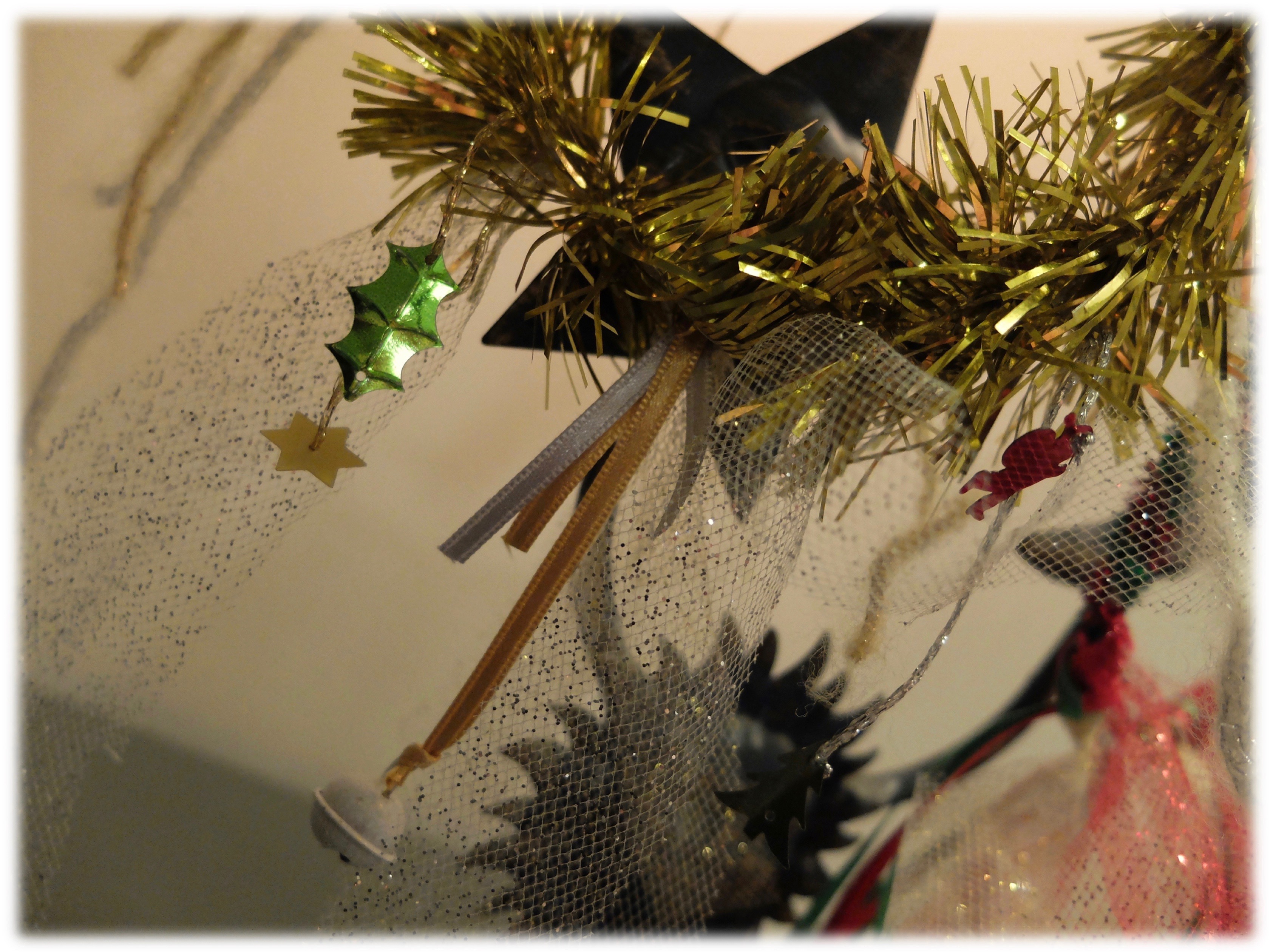 J’ai innové pour les CE2-CM1-CM2. J’avais envie de leur faire créer un objet décoratif à partir de plein de matières différentes : j’ai rassemblé mes chutes de laine, de tulle, de satin, de lurex, acheté des cercles de métal et quelques petits accessoires de Noël. Sous leurs mains imaginatives, tout cela s’est transformé en très beaux mobiles de Noël (auxquels mes photos ne rendent malheureusement pas hommage).