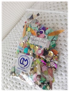 Lors de son atelier, Carole Magne nous a indiqué que les paillettes et perles que nous utilisions pour broder notre papillon étaient de qualité professionnelle et haute couture. Il s’agit de perles, paillettes et sequins « made in France » de la maison Langlois-Martin, vendues par le site Paillettes et Broderie. J’ai craqué pour un de leurs mélanges motifs vrac, et je confirme : ces paillettes sont magnifiques, d’une diversité étonnante, et un réel plaisir à travailler. J’en ai utilisé quelques unes pour terminer mon « Floral Burst Hoop », et j’ai retrouvé avec plaisir les techniques enseignées par Carole Magne pour finir mon papillon.