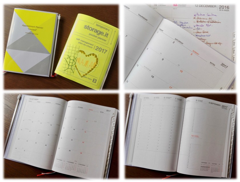 J’ai découvert l’an passé les agenda Storage.it de la marque japonaise Mark’s. J’aime la texture du papier, les onglets permettant d’identifier rapidement les mois, le planning mensuel situé juste avant la succession des plannings hebdomadaire, l’agencement des lignes, l’espace pour les petites notes, la possibilité de glisser des petits papiers en couverture intérieure… et extérieure. Avec cet agenda, organiser vies professionnelle, familiale et créative de façon intuitive et efficace devient un jeu d’enfant.