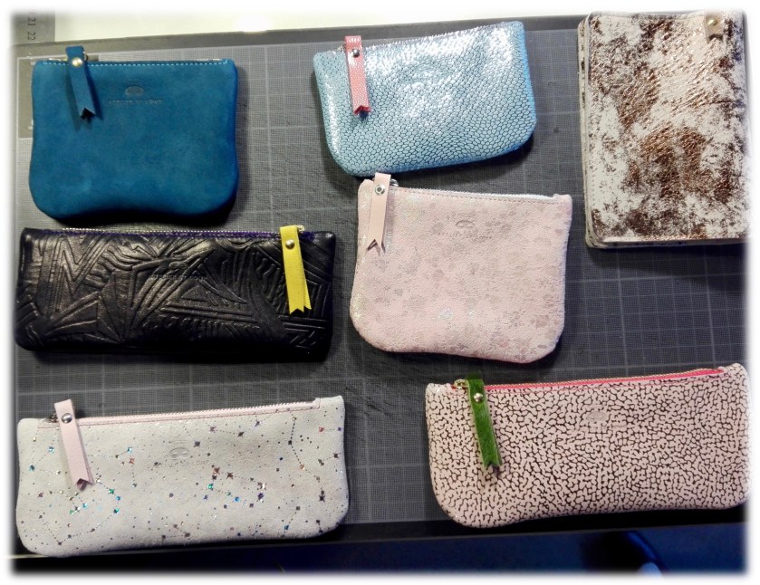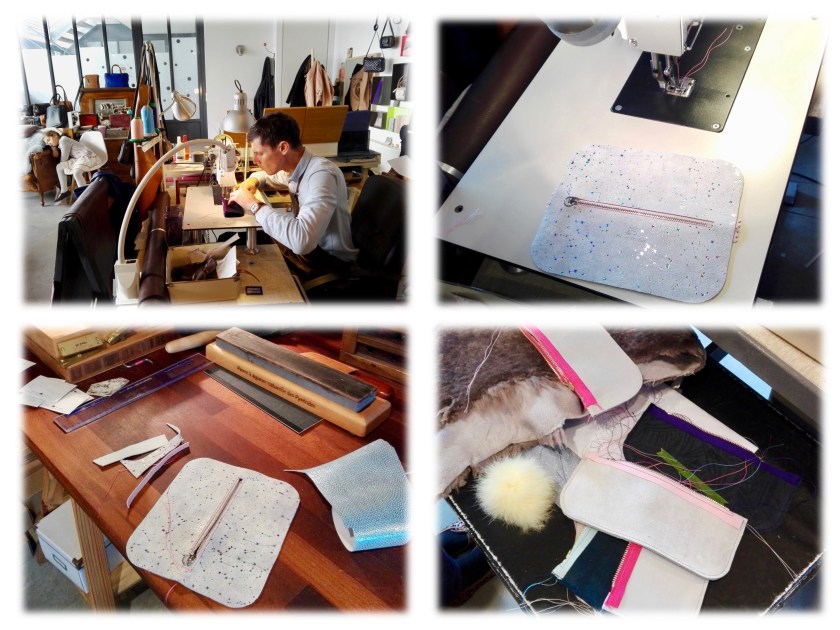 Le temps de faire connaissance avec les participantes (nous étions sept hier, dont une fillette de 9 ans), Isabelle et Michel nous expliquent ce que nous allons faire: nous pouvons choisir le modèle de petite maroquinerie que nous souhaitons confectionner parmi ceux qu’ils nous présentent, ainsi que le cuir, le zip, et la couleur du fil pour les coutures. Nous allons faire nous-même le placement, le traçage, la découpe, la mise en place du zip et la mise en forme finale, mais Michel reste le maître des machines: ce sera lui qui se chargera de la pression à chaud du logo de l’Atelier, des coutures à la machine, du brûlage des fils et de la pose du rivet de la tirette.