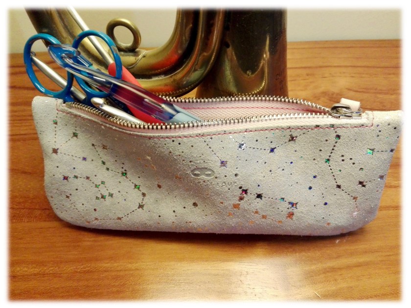 Je ne suis pas longue à me décider pour le modèle de la trousse plate: je la vois bien s’insérer dans mon sac d’en-cours, pour contenir crochets, petit ciseaux et marqueurs de mailles. J’ai envie d’un cuir clair, doux et souple. Je trouve vite mon bonheur dans les étoiles.