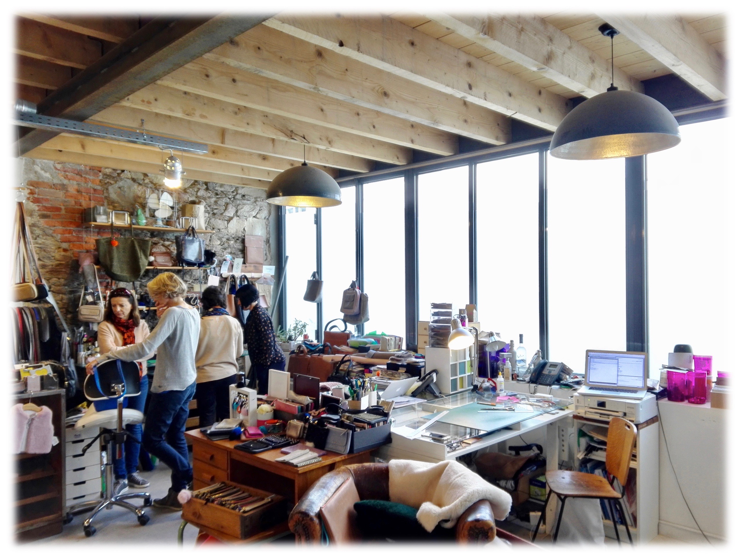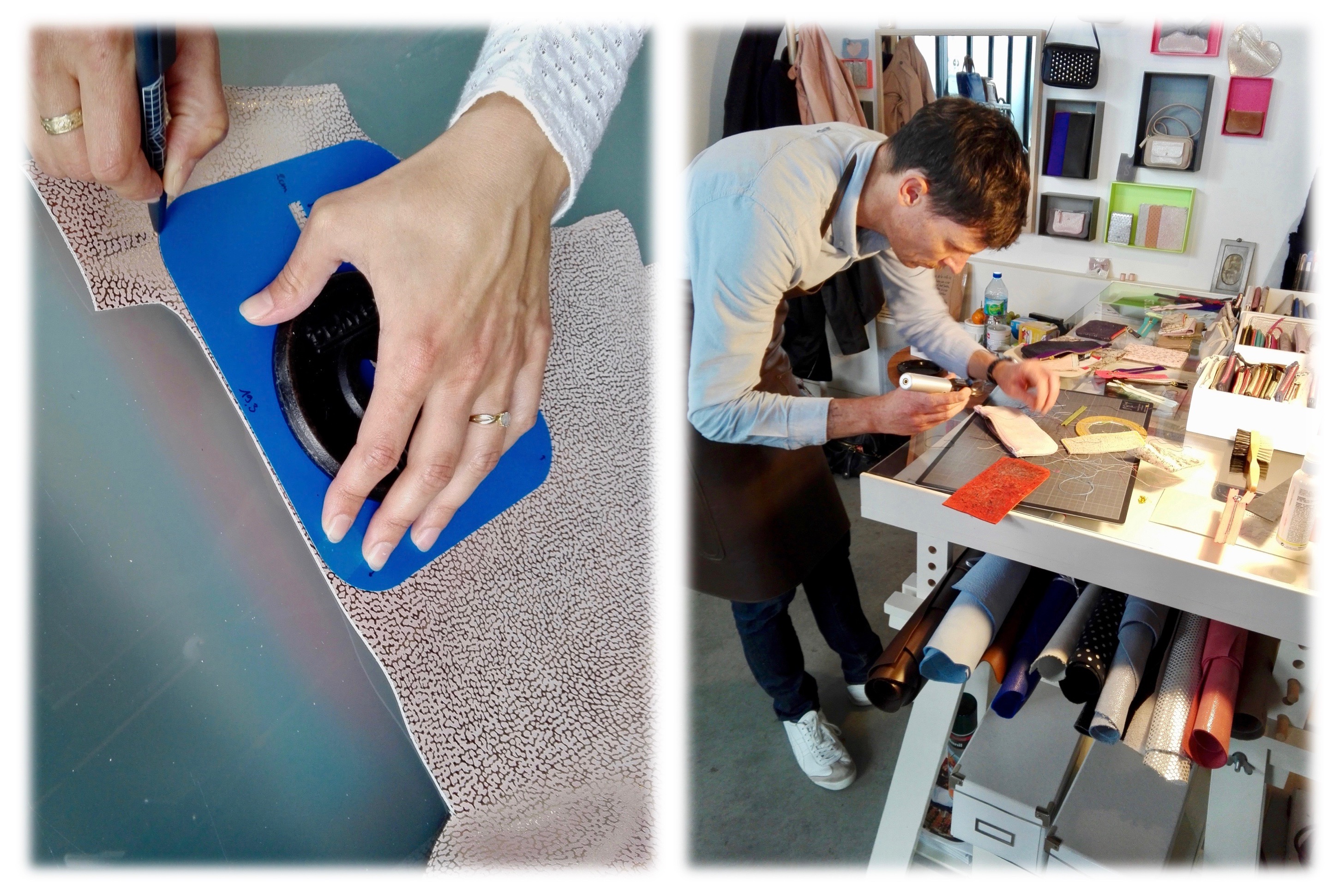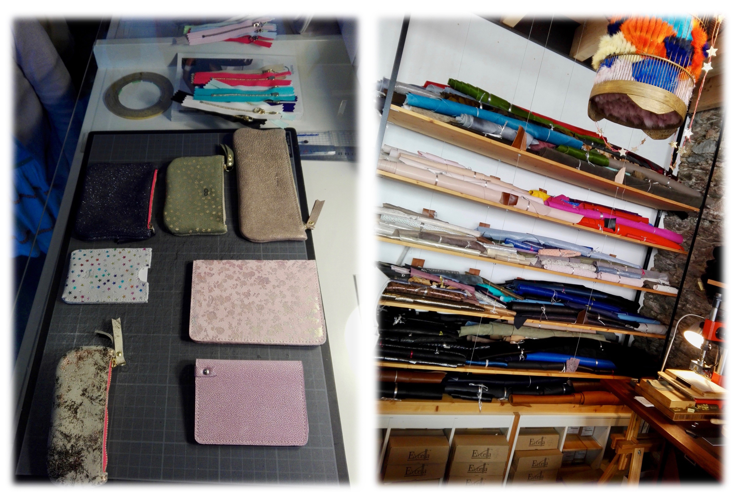 Entrer dans l’Atelier St. Loup est une expérience sensorielle très riche. Il y a d’abord cette bonne odeur de cuir qui saute au nez. Puis le regard se délecte des étagères remplies de matériaux, des machines rutilantes et des présentoirs débordants de couleurs et de matières qu’on a envie de toucher. La gentillesse et la simplicité de l’accueil mettent tout de suite à l’aise, tisane à l’appui. Cerise sur le gâteau pour moi, la bande-son diffusée en sourdine est en parfaite adéquation avec ce beau moment créatif.