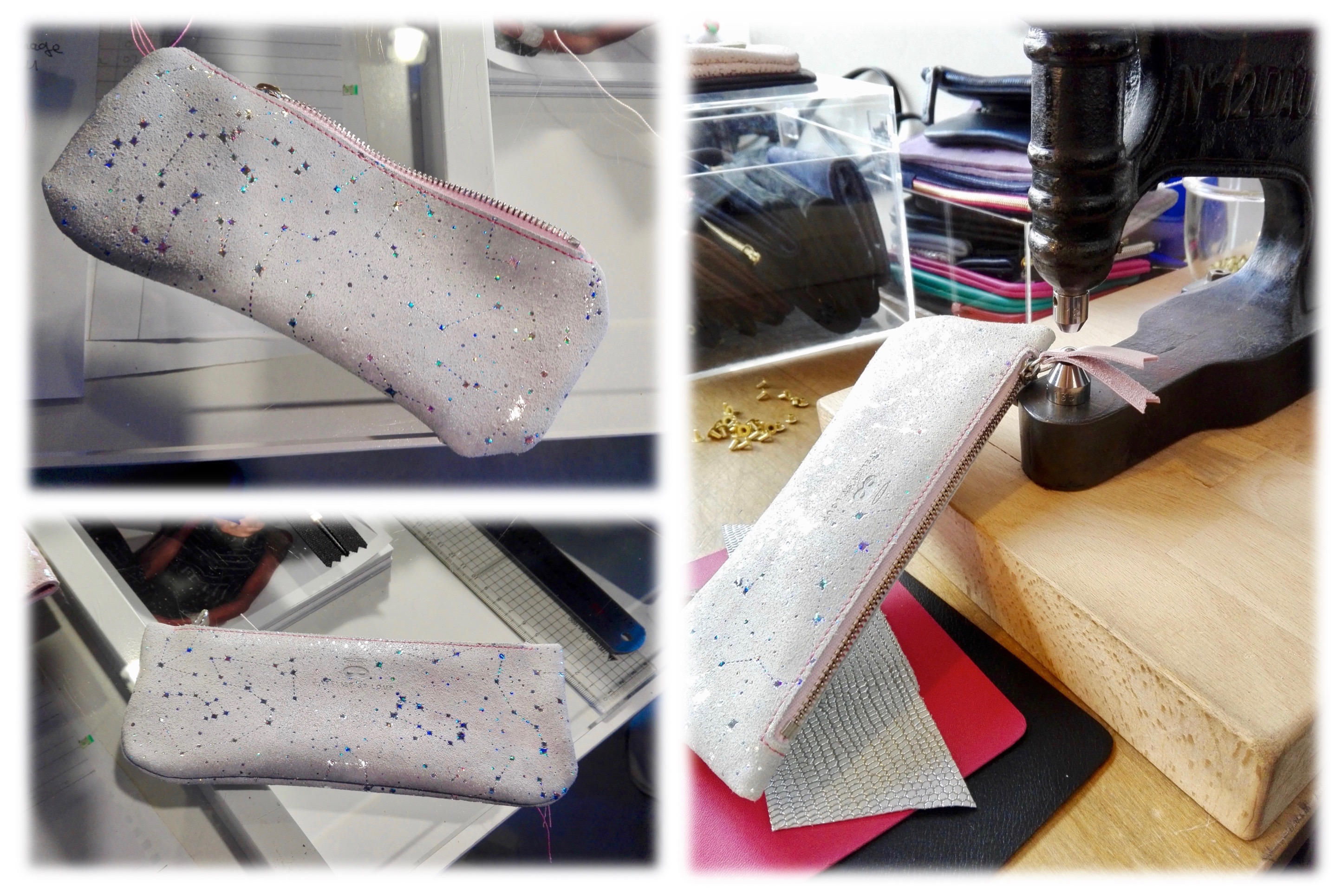 Je prends un plaisir énorme à réaliser toutes les étapes de montage de ma petite trousse constellée de lumière. Les matériaux utilisés par l’Atelier St. Loup sont d’une facture impeccable, c’est agréable de pouvoir travailler des matériaux d’une telle qualité, sous les conseils simples et efficaces d’Isabelle et Michel. Il est également plaisant d’échanger avec les autres participantes, et de pouvoir nous émerveiller ensemble devant nos « créations » qui peu à peu prennent forme.