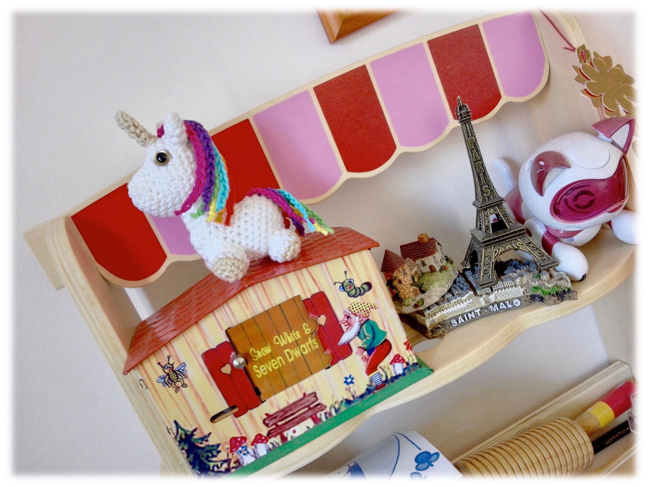 Mon Ahookit est donc arrivé vendredi après-midi. J’ai aimé le soin apporté à la confection du kit, parfait mélange d’artisanat et de précision (des matériaux bien rangés, un livret agréable et clair, et ce pochoir… tellement mignon!) Il ne m’aura fallu que quelques heures, réparties dans la journée et la soirée d’hier, pour donner naissance à cette petite licorne. Elle a vite été bien nommée Arc-en-ciel par sa petite destinataire, qui n’a pas tardé à lui trouver une place de choix dans sa chambre. Longue vie à toi, petite licorne! (et aux Ahookits d’Ophélie)