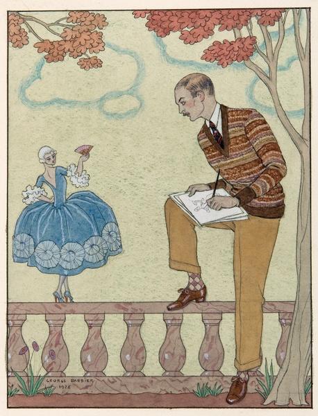 En plus de m’être plongée dans ce bel ouvrage qui lui est consacré (George Barbier: Master of Art Deco – Fashion, Illustration and Graphic Design, par Hiroshi Unno, aux éditions PIE International), j’ai mené de nombreuses recherches sur son œuvre et sa vie, ces dernières semaines. L’attirance immédiate qu’il a suscitée en moi ne diminue pas. Pourquoi m’intrigue-t-il autant? Est-ce parce que nous sommes nés dans la même ville, à une petite centaine d’années d’écart? Est-ce la multiplicité de ses talents, de ses centres d’intérêt, des supports qu’il utilise dans son travail? Je n’en sais rien, mais j’emprunte avec beaucoup de plaisir les chemins vers lesquels cet intérêt inattendu me conduit. Je me laisse porter vers l’histoire de l’Art Déco, vers les Années Folles, vers des aspects de ma ville qui m’étaient inconnus. J’aime le « tissu d’inspiration » que cela génère en moi. Je ne sais vers quelles réalisations cela me mènera, mais le processus en lui-même est déjà suffisamment agréable pour être noté.