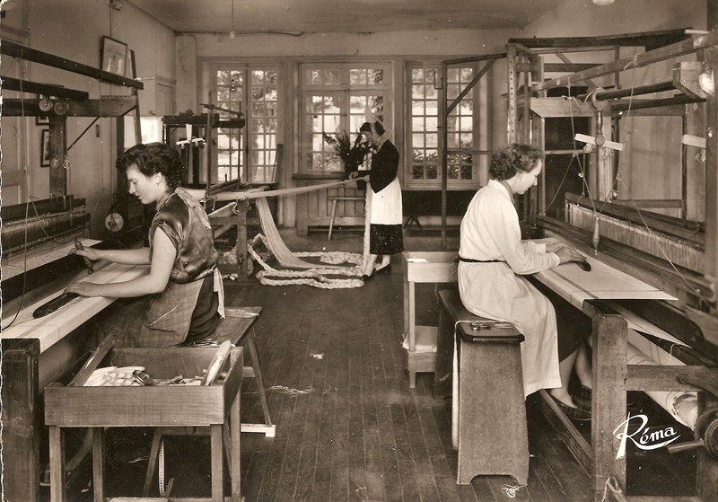 En 1935, M. Le Berre et Mme Andrieux, un commerçant de Quimper et une tisserande, décident de raviver la flamme du tissage à Locronan, et c’est là l’origine du bâtiment délabré devant lequel je me suis arrêtée il y a un mois. Tous deux s’associent pour acheter quatre métiers à tisser qu’ils installent à Locronan, et ils donnent ainsi naissance à l’atelier de tissage artistique St Ronan, qui sera actif jusqu’en 1991 (voir plus de détails à la source de ces informations et des deux cartes postales en noir et blanc ci-dessus et ci-dessous).