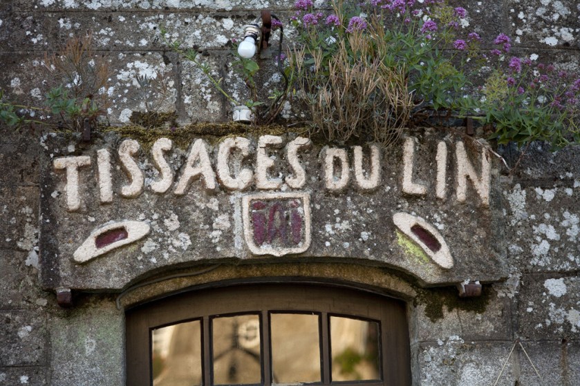 Cet automne, j’ai découvert Locronan. J’ai été sensible à la beauté de cette « petite cité de caractère », préservée du passage du temps et de la modernisation architecturale. J’ai apprécié le calme de ses rues (qui le sont peut-être moins en saison estivale) et la diversité de ses échoppes artisanales (cuir, verre, textile, bijoux). Dans l’église du village, l’église St Ronan, je suis restée en admiration devant de magnifiques bannières de procession, éblouie par leurs couleurs et la richesse de leurs détails. J’ai noté dans un coin de ma tête d’ajouter Locronan et ses bannières à mes « recherches à faire ». Cette liste de recherches s’est encore étoffée à la sortie du village, au moment de rejoindre le parking. Face à ma voiture, j’aperçois un bâtiment abandonné, sur lequel je déchiffre une inscription délavée: « Atelier St Ronan Tissage artistique à la main ». Je ne résiste pas à l’envie de m’approcher, avec l’espoir de découvrir que les lieux ne sont pas aussi abandonnés qu’ils en ont l’air. Mais ils le sont.