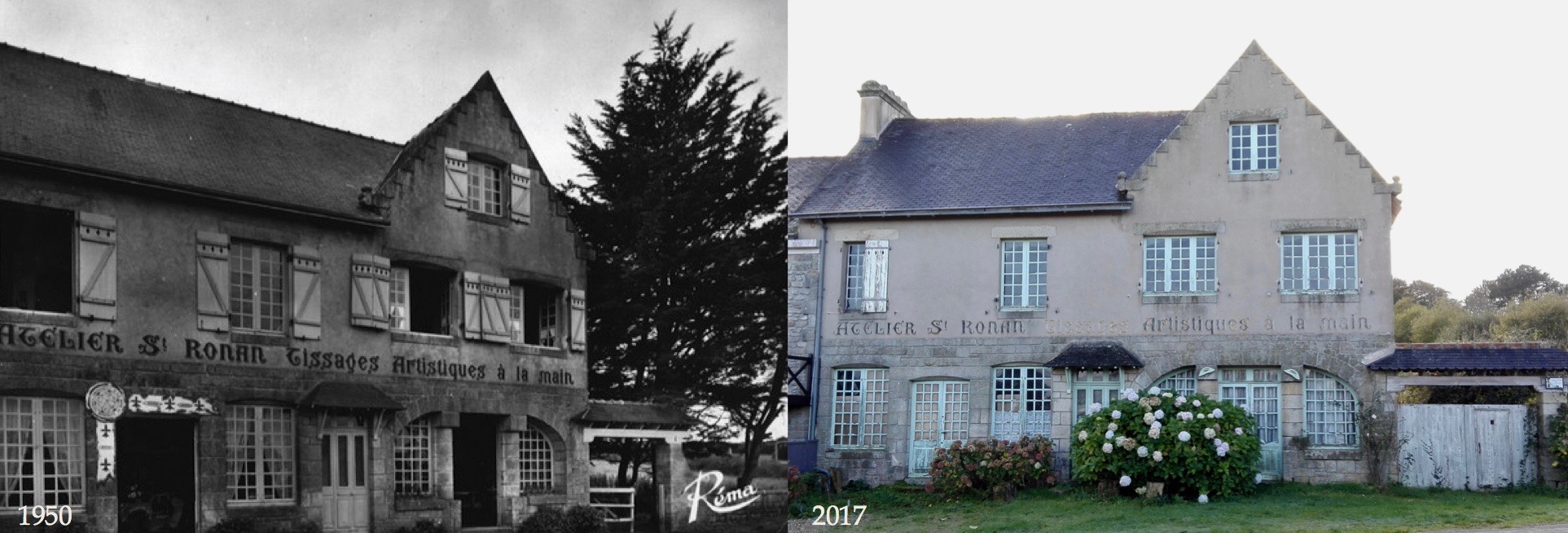 En 1935, M. Le Berre et Mme Andrieux, un commerçant de Quimper et une tisserande, décident de raviver la flamme du tissage à Locronan, et c’est là l’origine du bâtiment délabré devant lequel je me suis arrêtée il y a un mois. Tous deux s’associent pour acheter quatre métiers à tisser qu’ils installent à Locronan, et ils donnent ainsi naissance à l’atelier de tissage artistique St Ronan, qui sera actif jusqu’en 1991 (voir plus de détails à la source de ces informations et des deux cartes postales en noir et blanc ci-dessus et ci-dessous).
