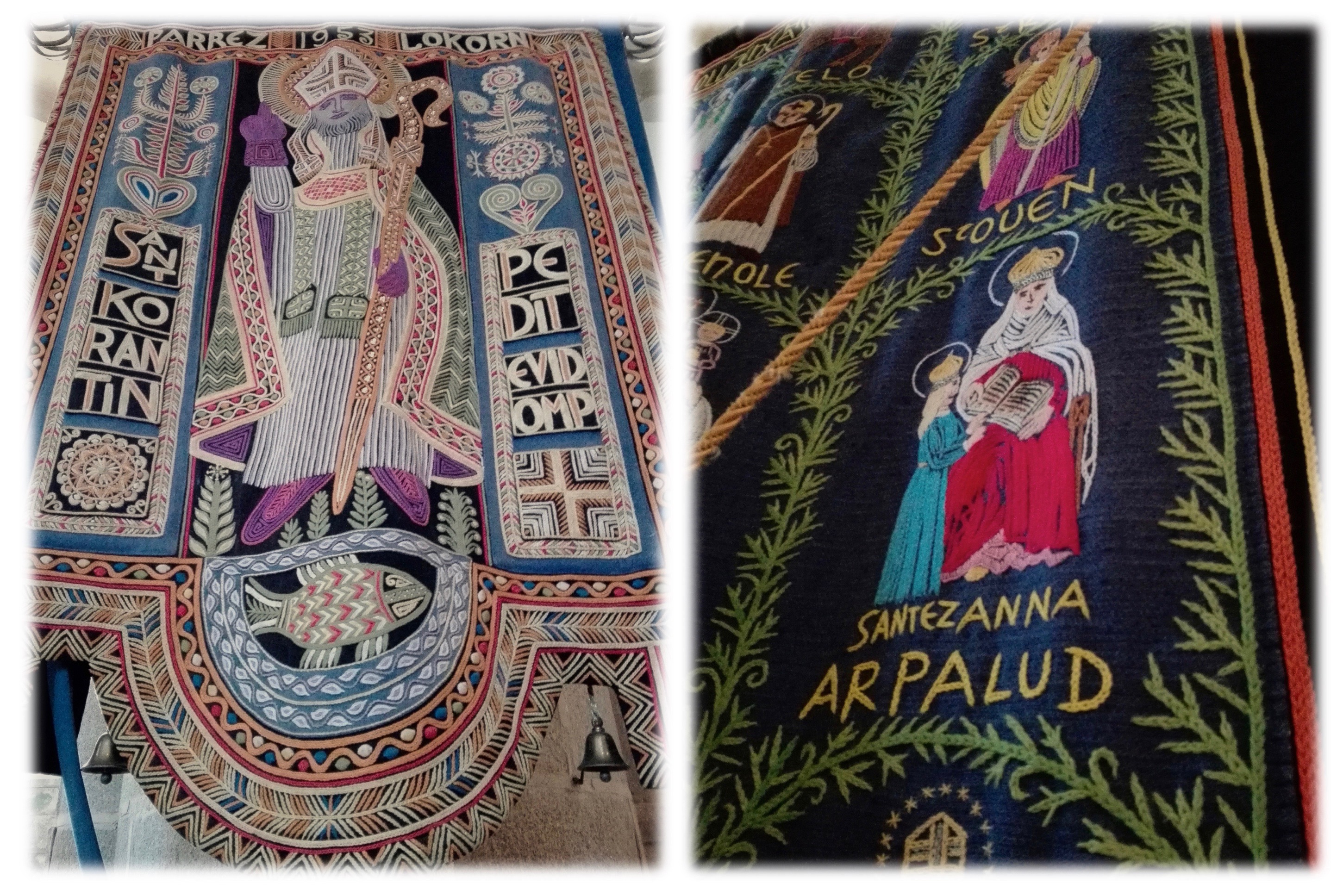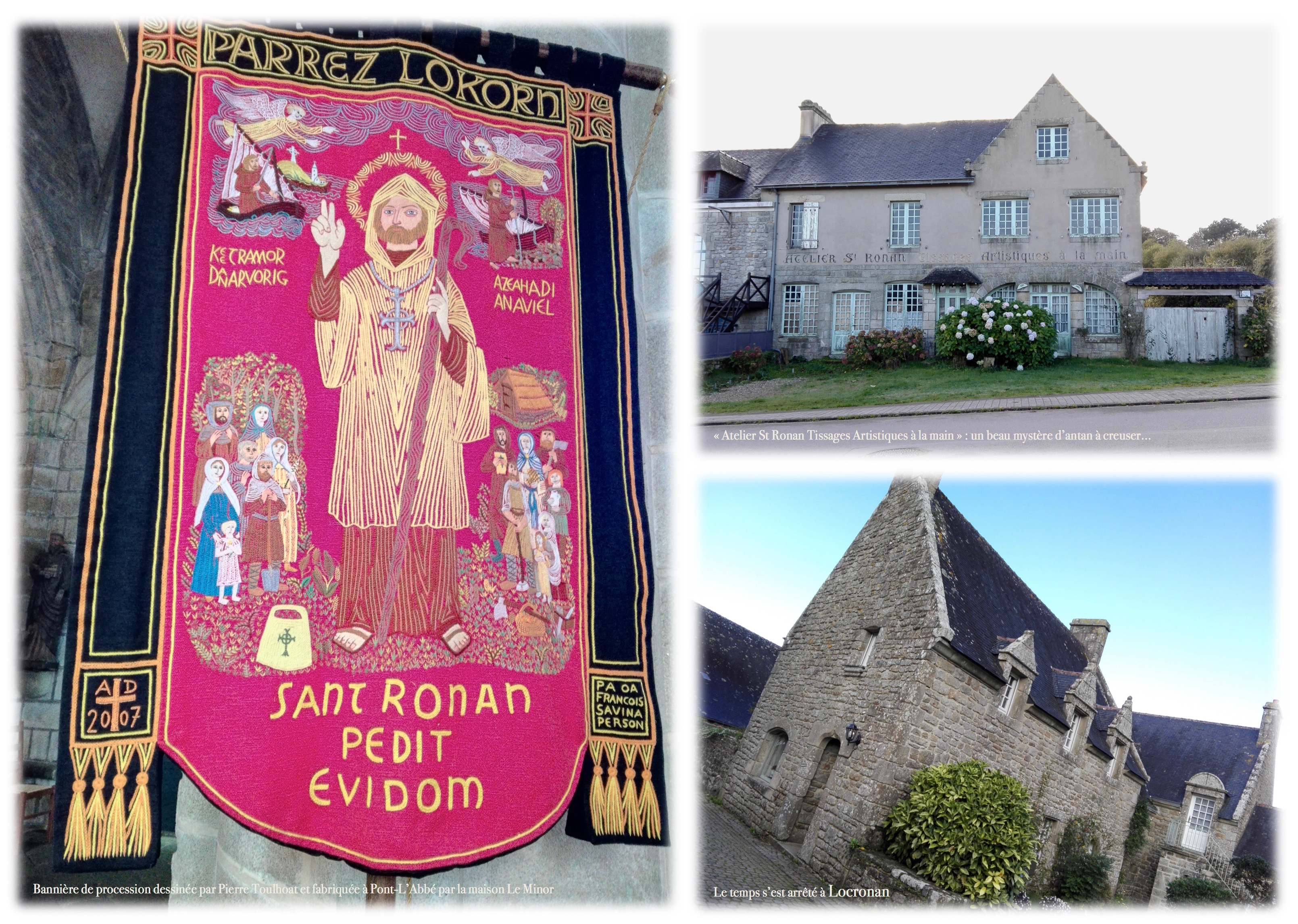 Quand je m’attelle à cette partie de mes « devoirs de vacances » en rentrant chez moi, je découvre rapidement que les tissages que j’ai admirés dans l’église St Ronan sont des bannières de processions dessinées par l’artiste breton Pierre Toulhoat et réalisées par la maison Le Minor de Pont L’Abbé. Entre 1953 et 2007, Pierre Toulhoat et la maison Le Minor ont collaboré sur la création de treize bannières de procession, comme le raconte un article du Télégramme, au moment de la livraison de la 13e bannière à l’église de St Ronan en 2007.