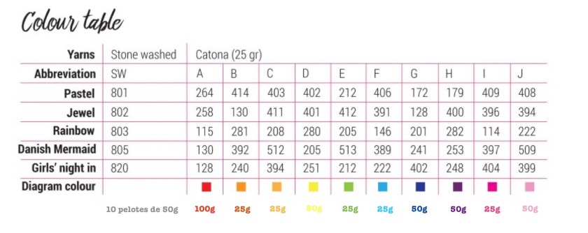 Pour les personnes qui souhaiteraient réaliser ce beau projet mais qui ne trouvent plus le kit, voici le grammage des pelotes qui composaient le mien (à moduler en pelotes de 25g, 50g ou 100g pour le Catona):