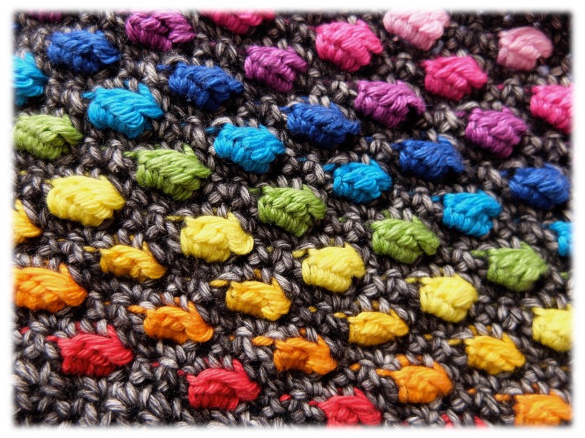 Pour le moment, je tiens le rythme Scheepjes. En 7 jours, j’ai fini les instructions de la semaine 1: des points soufflés en Catona parsemés dans des rangs de mailles serrées en Stone Washed. Pas évident, mais j’ai fini par prendre le coup de main, et je suis plutôt satisfaite du résultat.