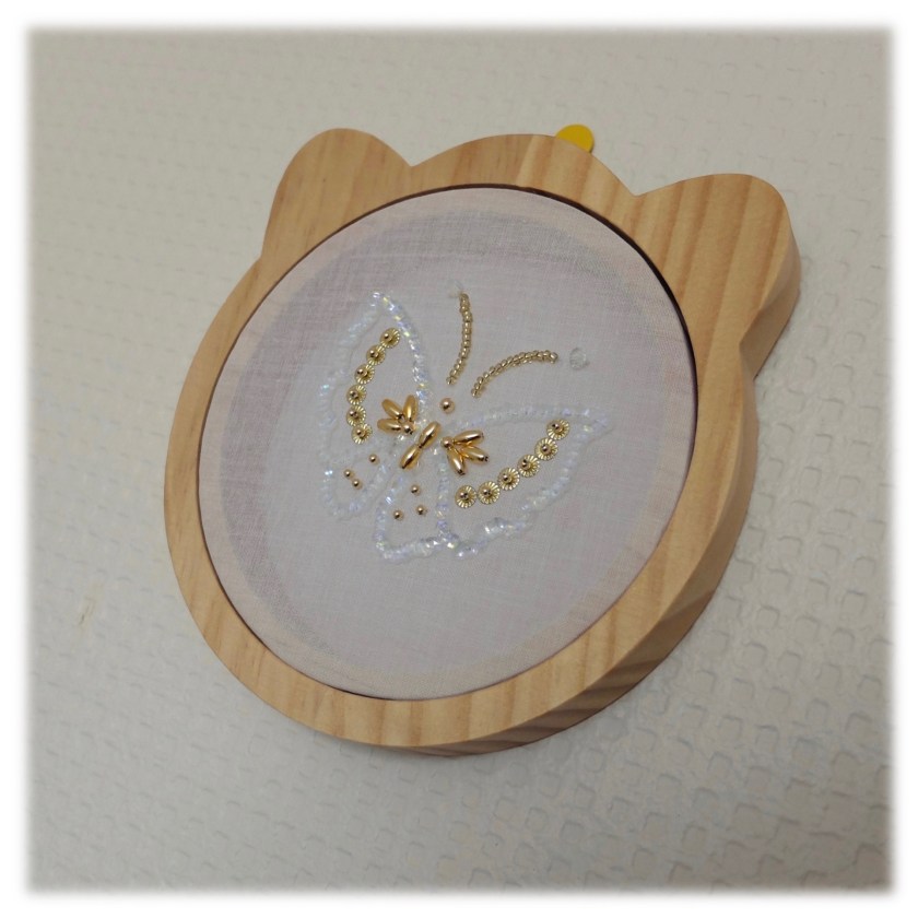 D’autres paillettes Langlois-Martin ont trouvé leur cadre, en cette fin d’année. Mieux vaut tard que jamais: le papillon brodé en avril dernier lors d’un atelier avec Carole Magne au salon « Pour l’amour du fil » a enfin trouvé sa place sur l’un des murs du Petit Atelier Nantais (cadre tambour ourson DMC).