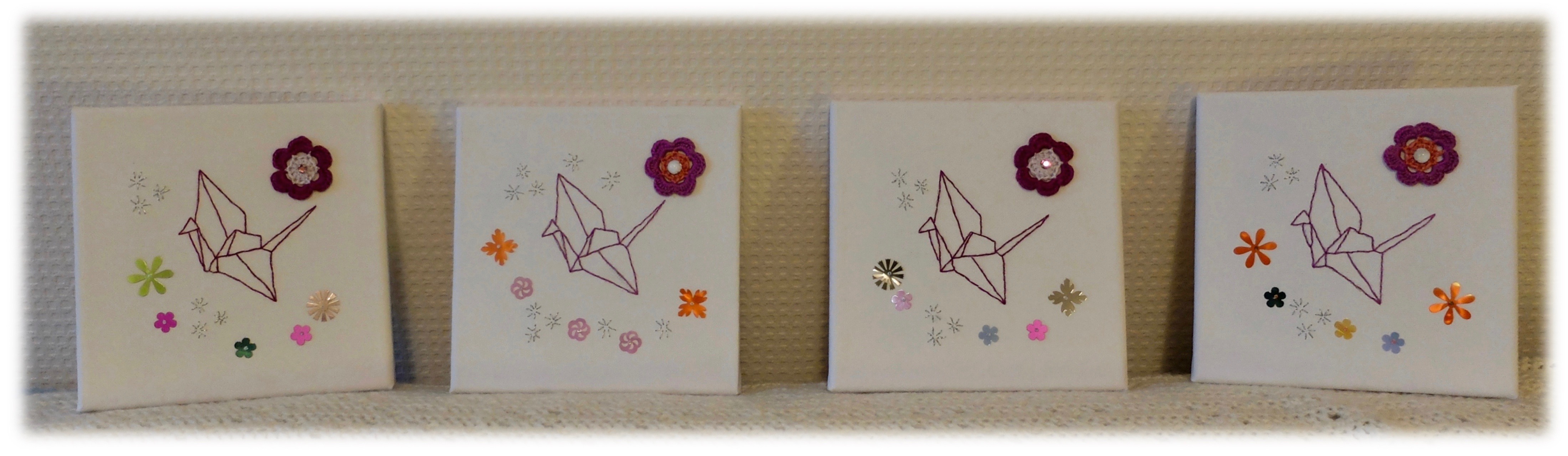 Ces fleurs ont vite trouvé place en bordure de petits châssis entoilés, sur lesquels j’ai brodé une grue et des étoiles (d’après un des motifs gratuits de DMC). J’ai rajouté quelques paillettes Langlois-Martin, une pierre de lune ou une rosette au cœur de chaque fleur, et cela a donné une série de cadres sobres mais scintillants, n’attendant qu’à être glissés sous le sapin.