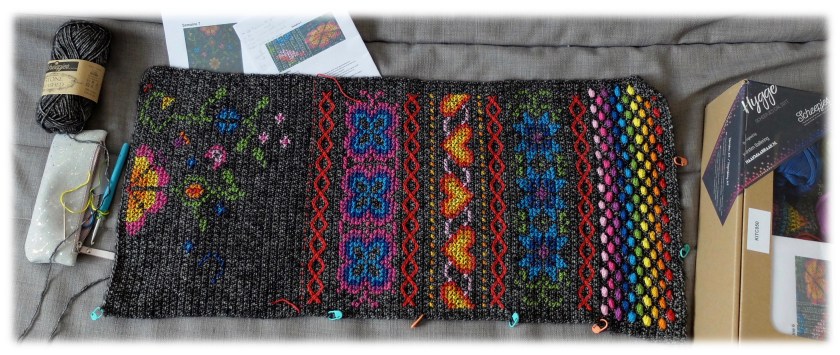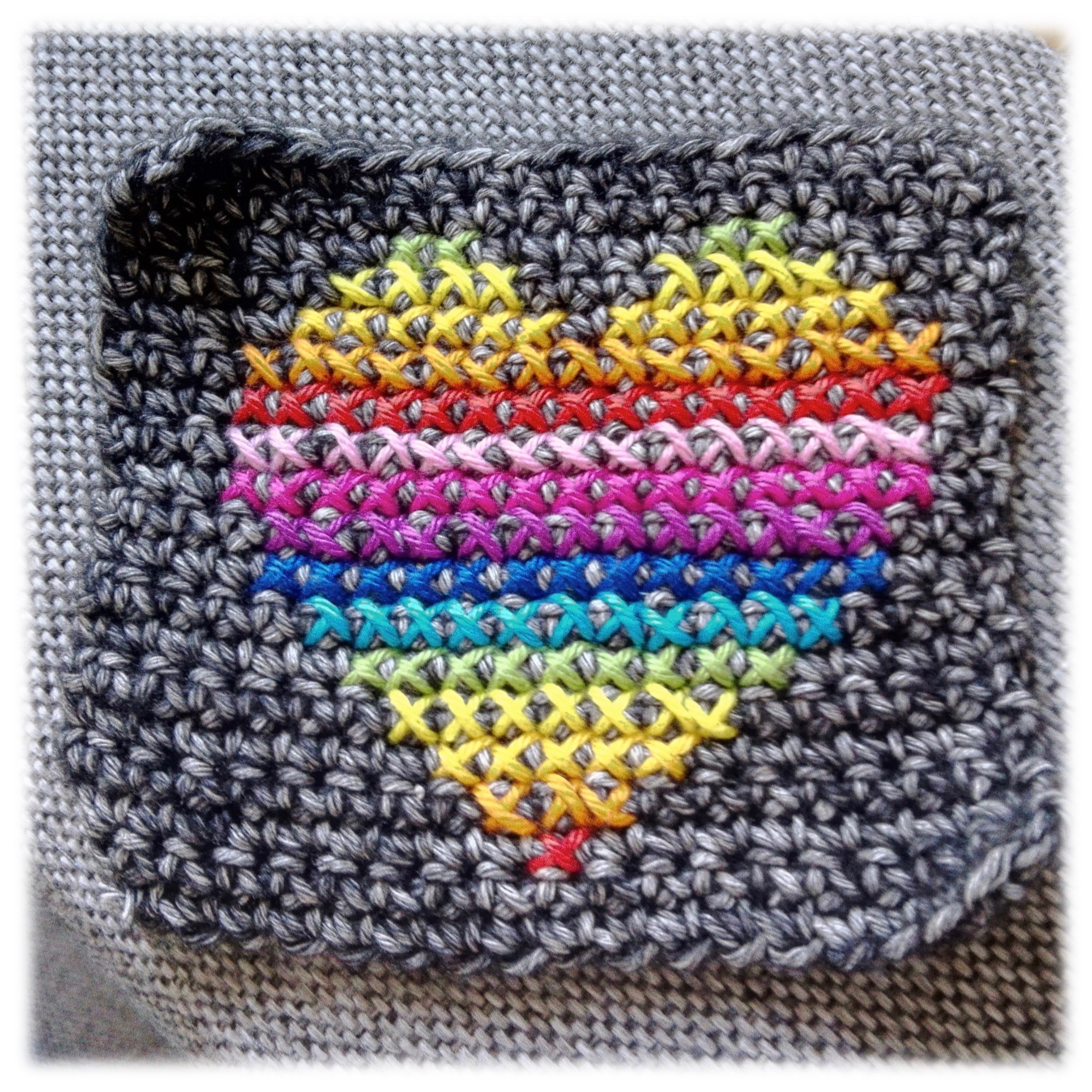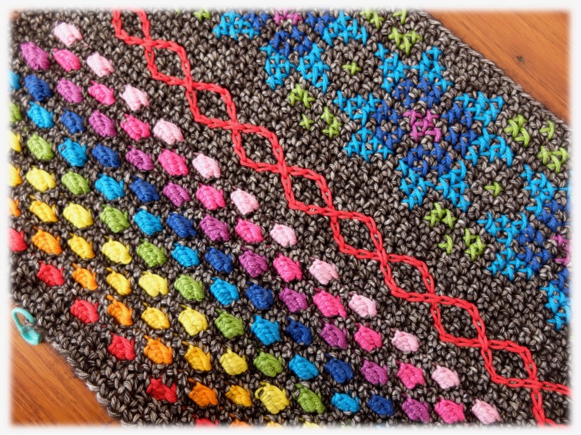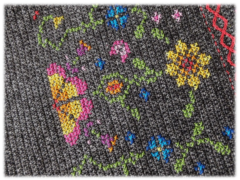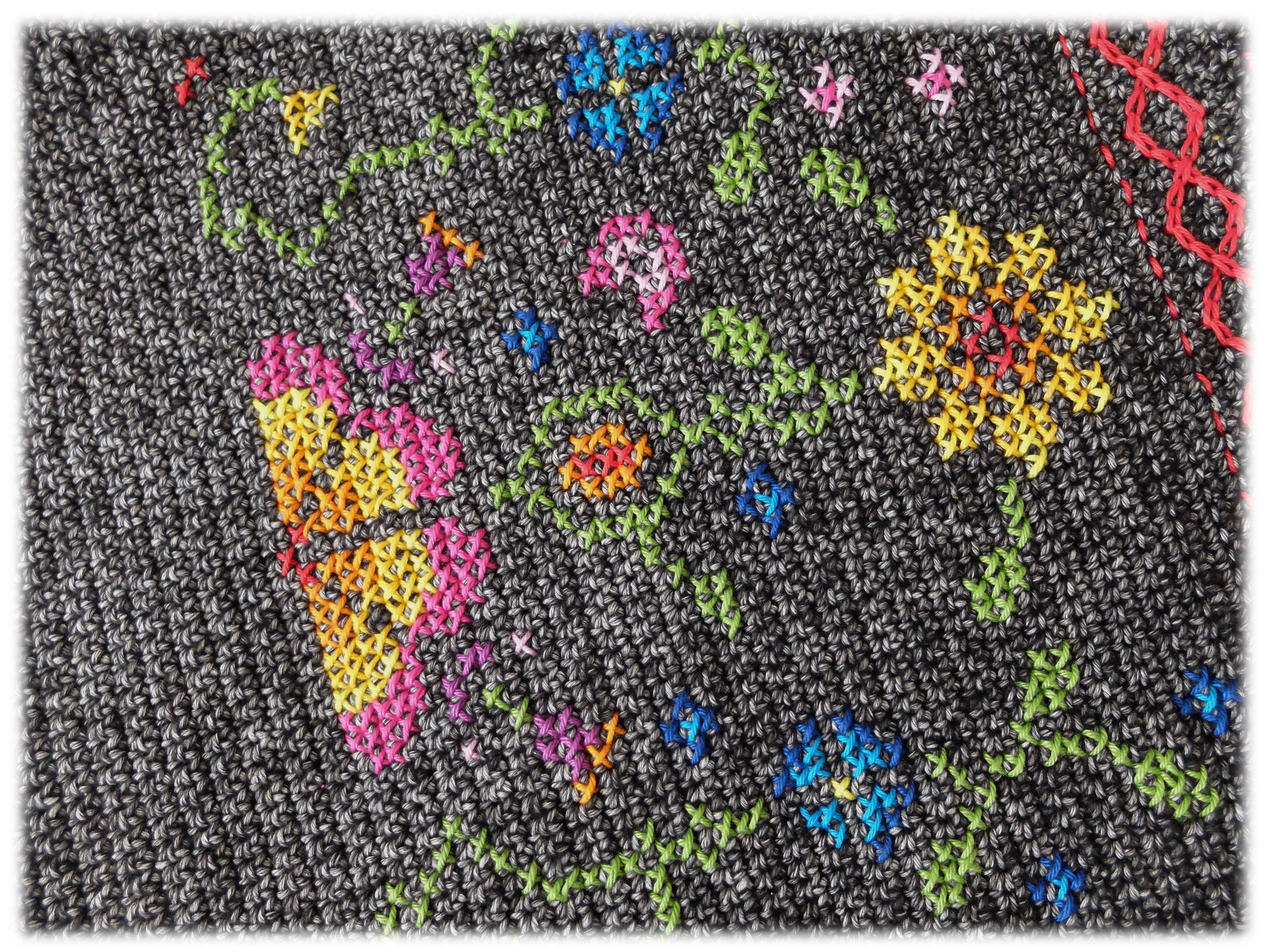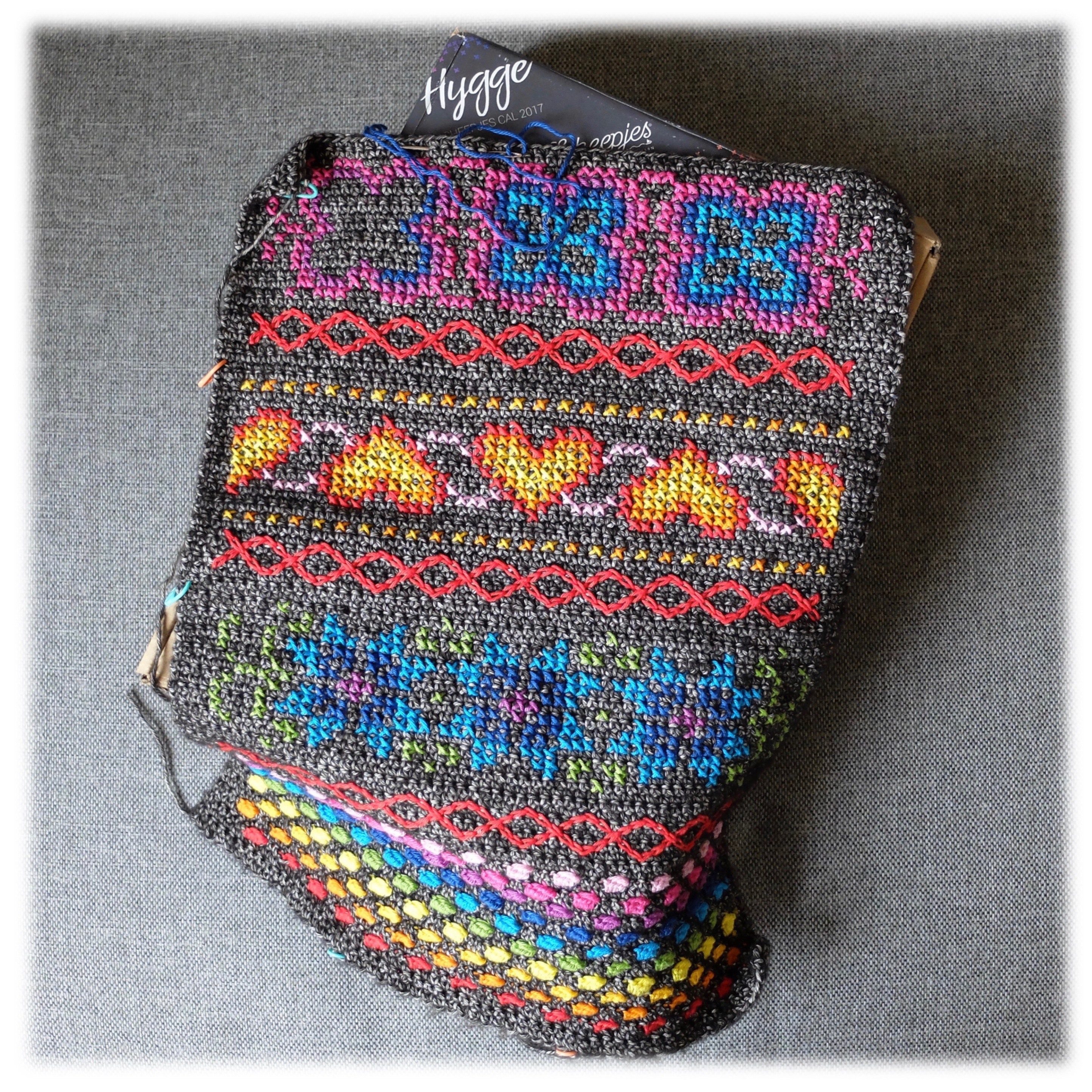 Les fils de coton Catona et Stone Washed sont vraiment doux et très agréables à travailler. En terme de difficulté, niveau crochet, passés les points soufflés de la première semaine, il n’y a que deux points à connaître: la maille serrée et la maille coulée. Niveau broderie, c’est du point de croix. Et broder du point de croix sur des mailles serrées est une expérience réjouissante et ludique… une des définitions possibles du hygge, j’imagine.