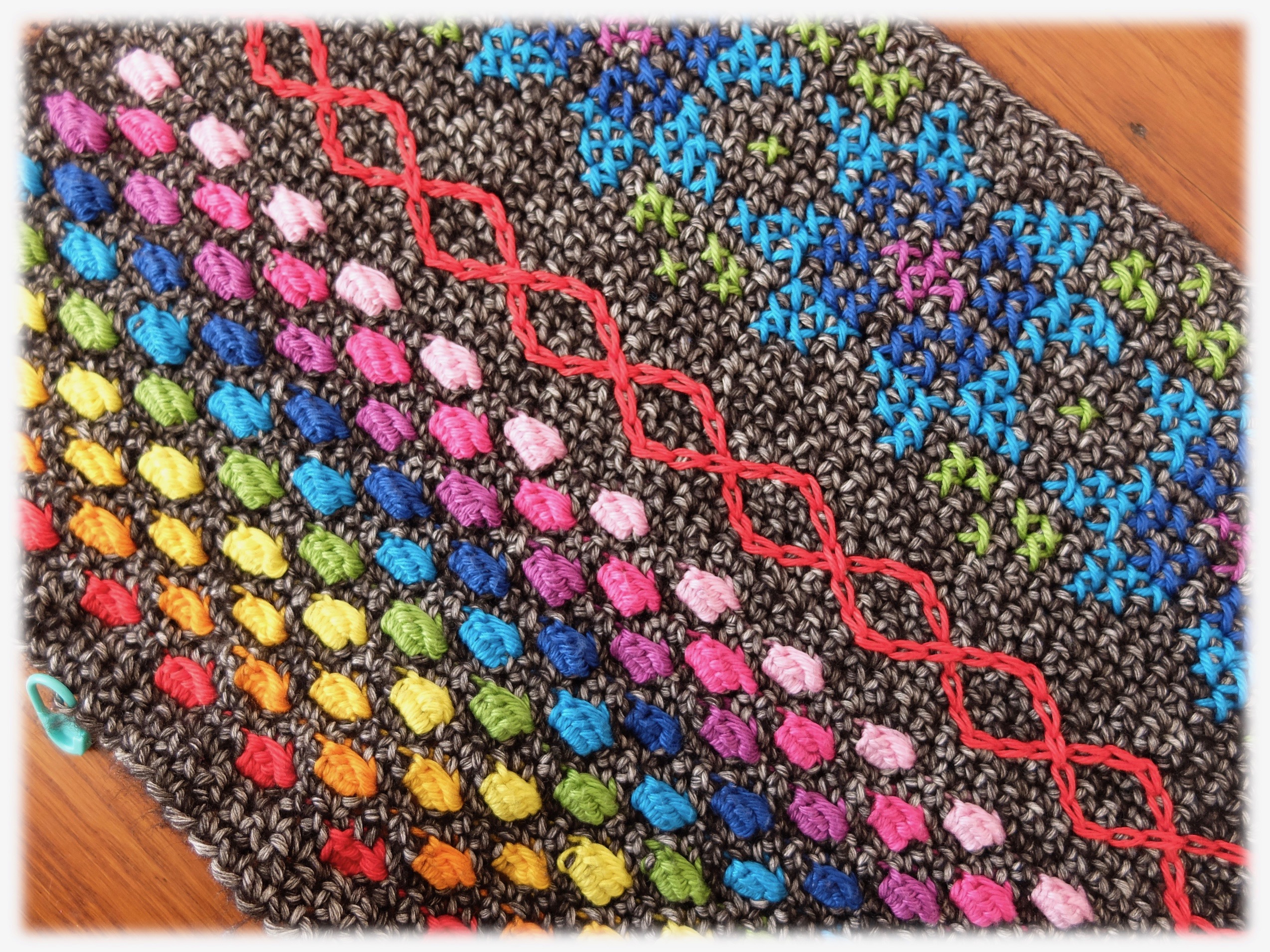 Pour le fond, il faut 10 pelotes de Stone Washed, et oui, il est prévu de le doubler pour cacher les fils de la broderie à l’arrière.