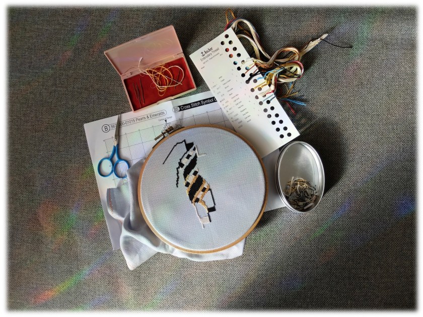 Devenue diagramme de point de croix dans les années 2000, cette belle déesse se brode avec un grand plaisir depuis samedi dernier. Les matériaux du kit Maia sont très agréables à travailler. C’est un en-cours supplémentaire qui s’ajoute à ma liste, mais en ce chaud début d’été, la broderie est plus motivante que le crochet, et le point de croix un repos bien appréciable pour l’esprit en surchauffe. Mais surtout, ce projet ne sera pas trop volumineux à glisser dans la valise des vacances!