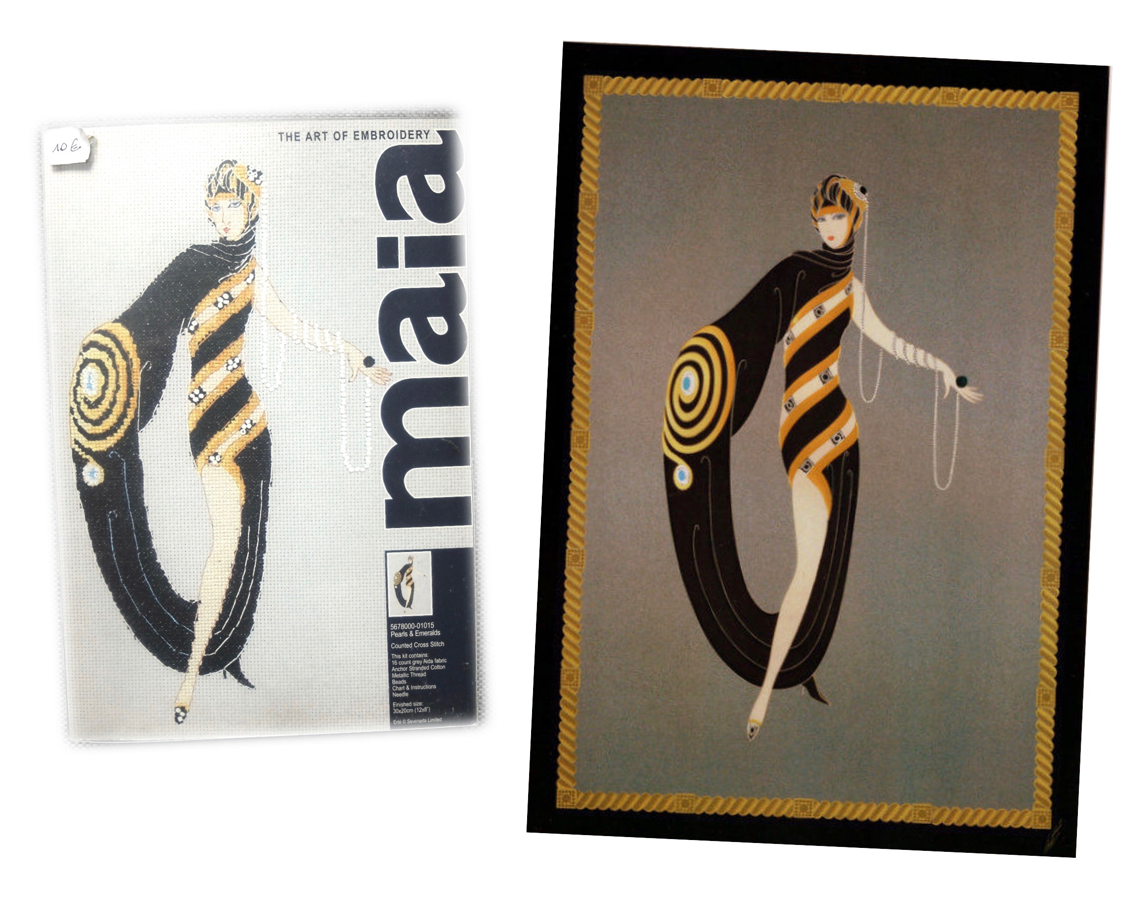 Voici une histoire de fil qui commence par une triste nouvelle, pour se terminer sur un beau hasard. Il y a quelques temps, j’ai appris que la mercerie Au Fil d’Or, en haut du passage Pommeraye, allait fermer définitivement à la fin de cette semaine, et liquidait donc son stock. Une mercerie qui ferme, c’est toujours un pincement au cœur. Je m’y suis rendue samedi dernier et j’ai fait de très belles trouvailles: des bobines de mes fils à couture DMC préférées (fils à boutons et à draperie des années 70-80) à 1€, et un kit de broderie point de croix Maia à 10€ (au lieu de 47). Mais la beauté de la trouvaille ne réside pas dans l’économie effectuée: ce kit de broderie présente un visuel inspiré d’un illustrateur contemporain (et ami) de George Barbier, Romain de Tirtoff, dit Erté.