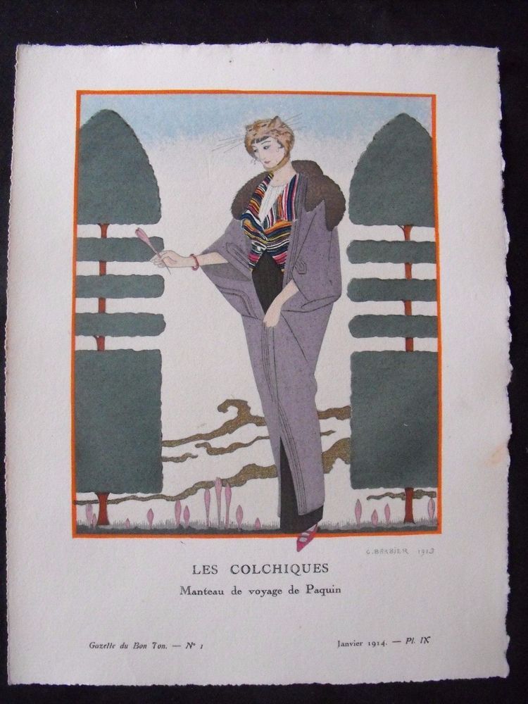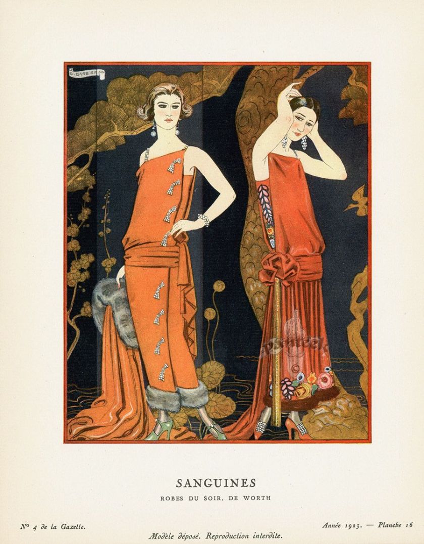 Les planches issues de la Gazette du Bon Ton étaient d’une excellente qualité: elles se vendent aujourd’hui encore à très bon prix dans les ventes aux enchères ou sur les sites de vente en ligne. Elles étaient imprimées sur papier vergé en utilisant la technique du pochoir. Dans un article publié en février 1928 dans la revue Arts et métiers graphiques, George Barbier explique tous les avantages qu’il trouve à cette technique pour un rendu précis et fidèle au travail original de l’artiste. Cet article est lisible ici sur Gallica, ou là en PDF (PDF téléchargé depuis Gallica).