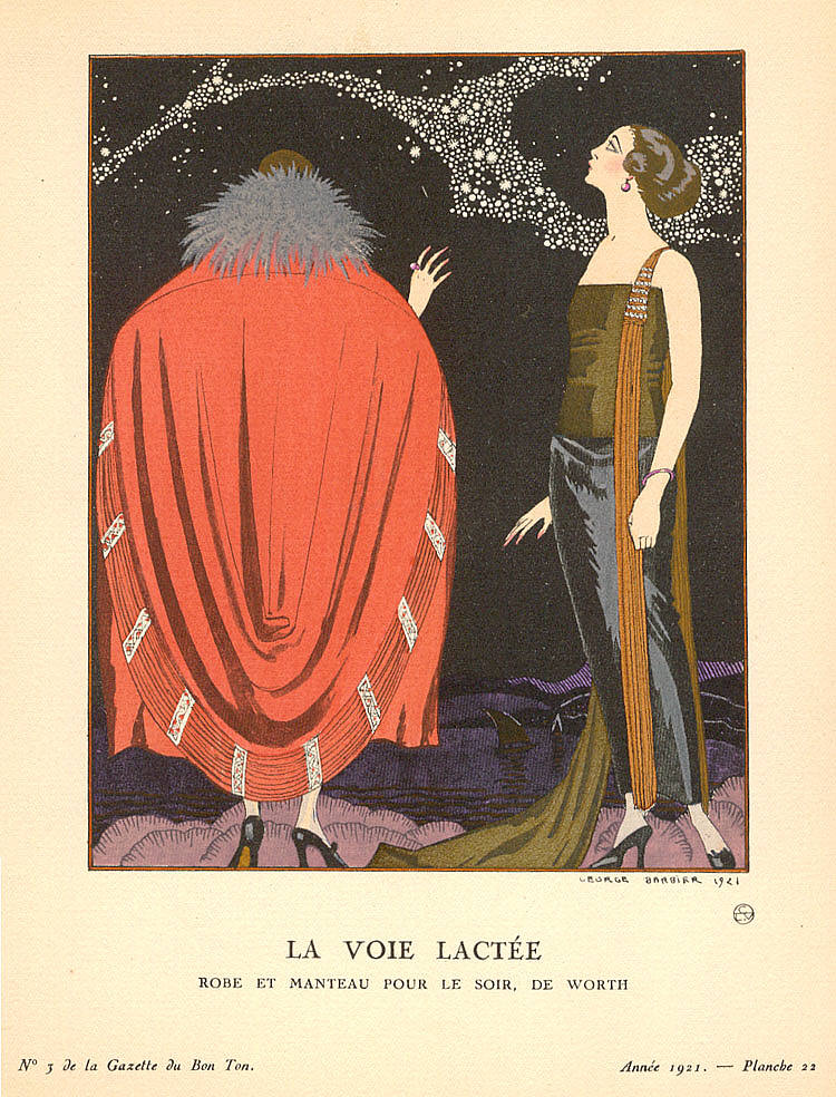 George Barbier a illustré les tenues d’autres grandes maisons, comme Worth ci-dessus et ci-dessous (même en ajoutant Paul Poiret, Jean Patou ou Georges Dœuillet, Jeanne Lanvin, Madeleine Vionnet ou Coco Chanel à cette prestigieuse liste des grands noms de la mode des années 1910-1920, il y a autant de femmes que d’hommes, fait assez marquant pour être noté).